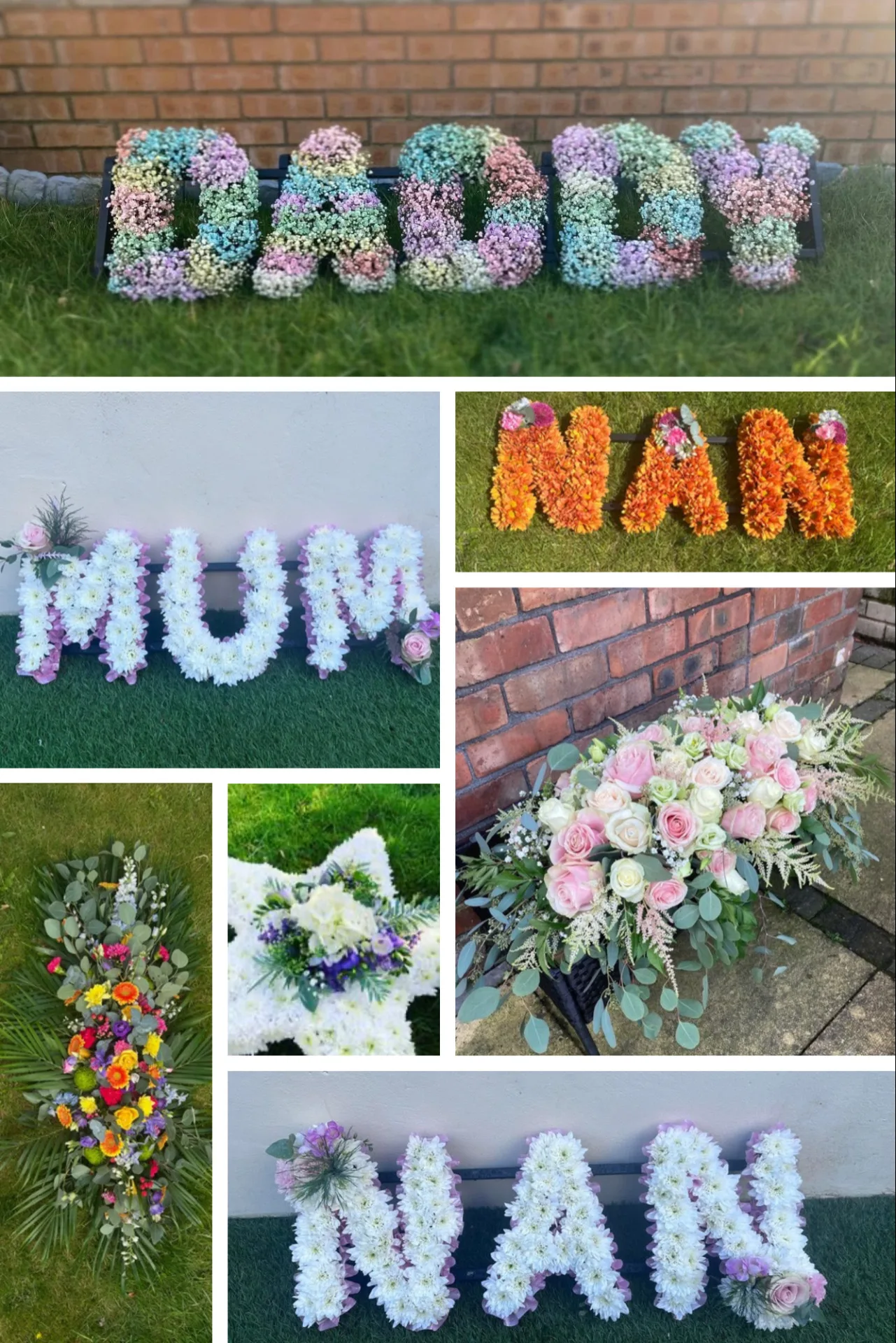 - Funeral Tributes: Traditional and modern letter tributes, hearts, crosses, and custom designs.