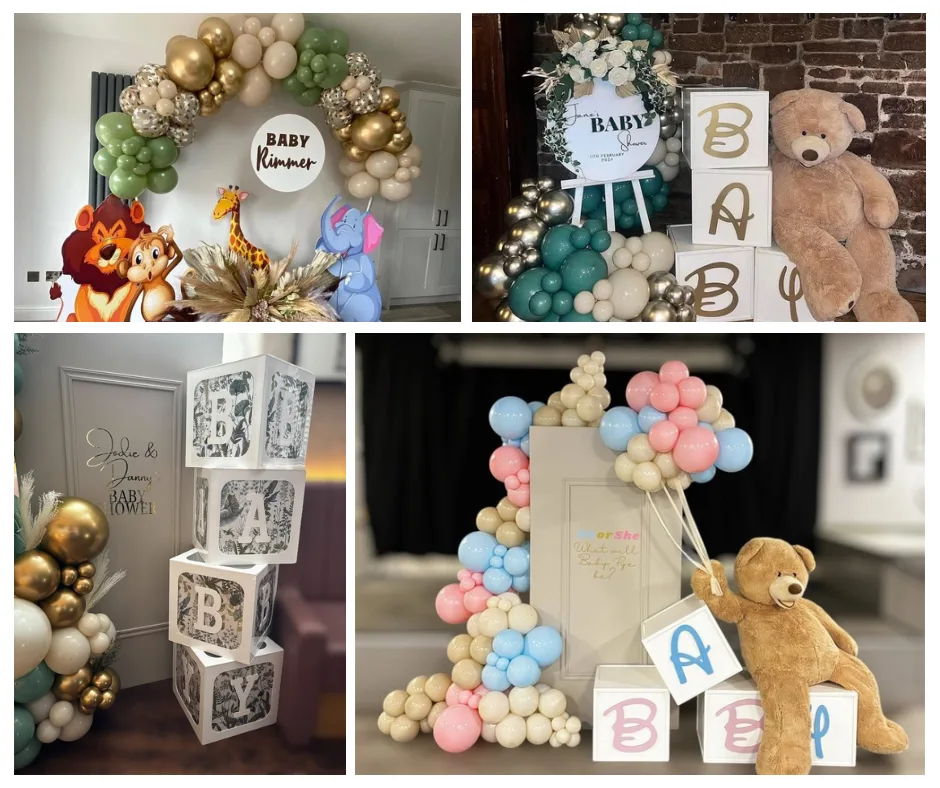Popular baby shower balloon décor options include: