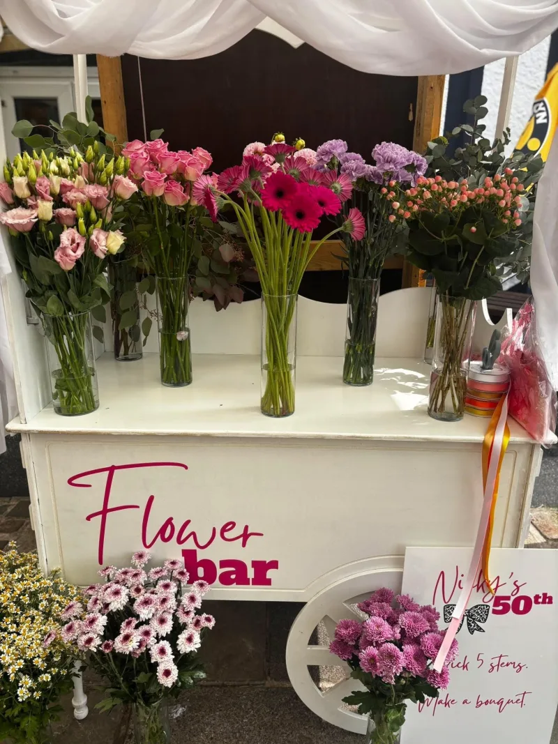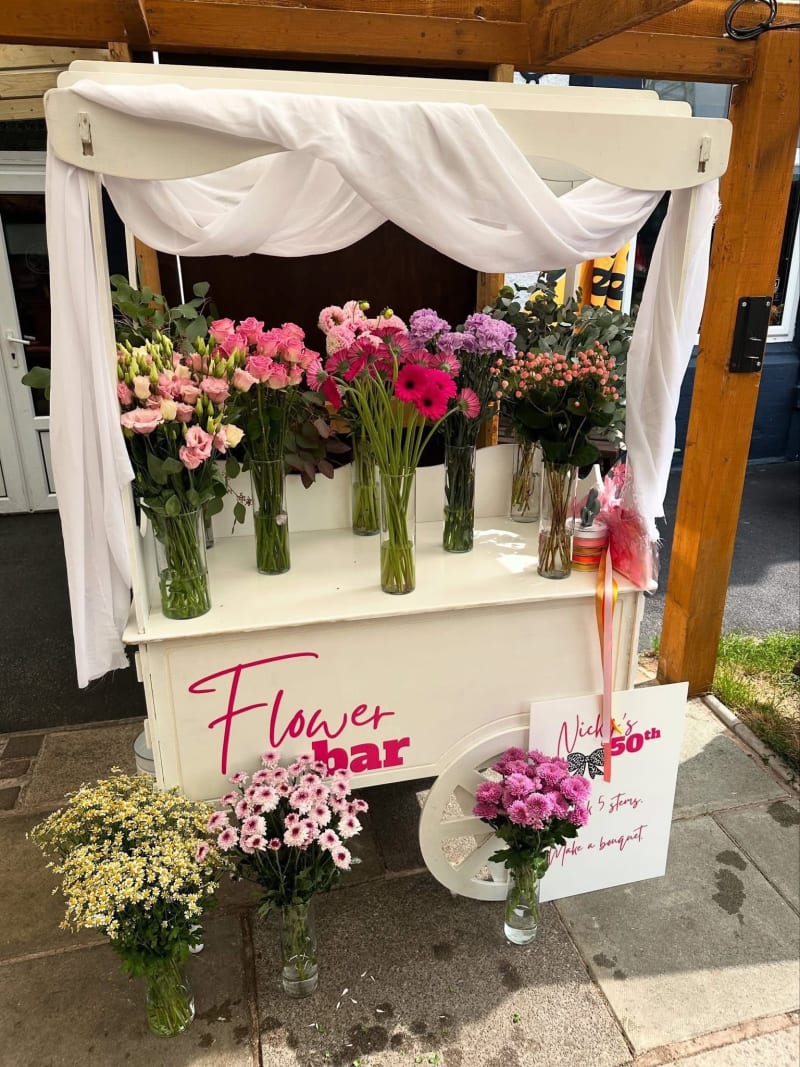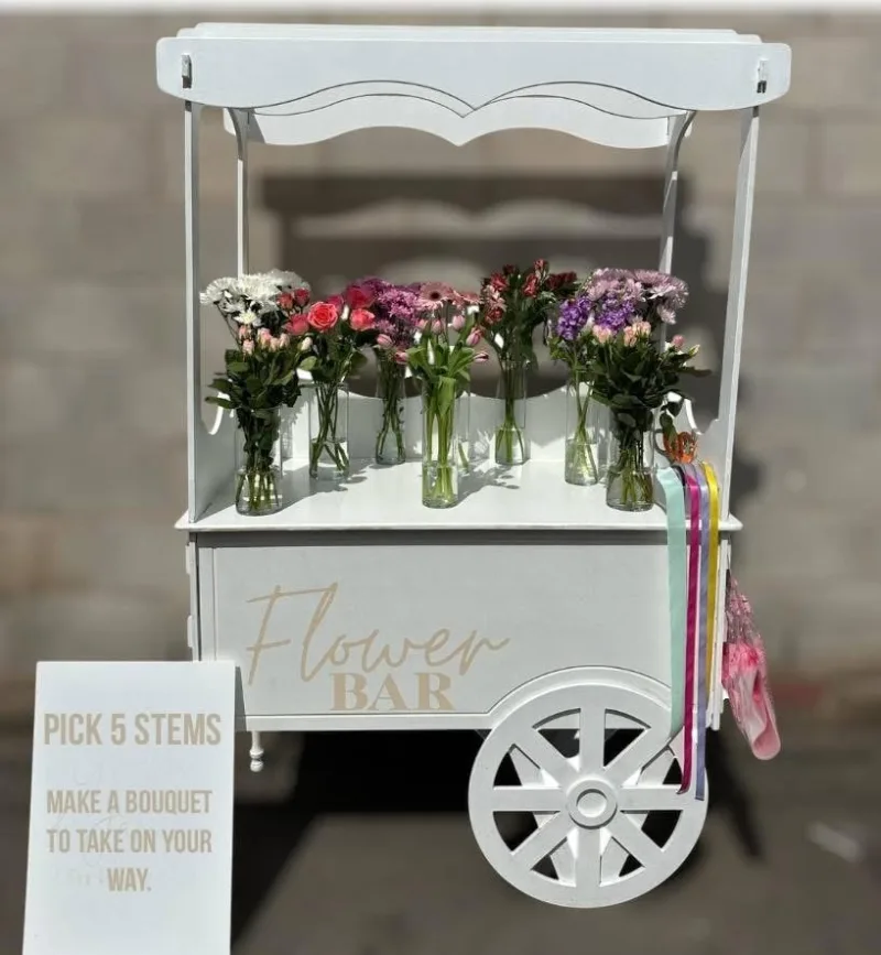 A flower bar is a fully styled floral station filled with fresh, seasonal blooms, foliage, and wrapping materials. Guests can select their favourite stems and design their own bouquet, guided by our team if required.