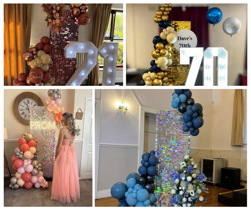 Mini sequin wall set up with attached balloon garland and LED Number. Optional - neon sign or floral piece.